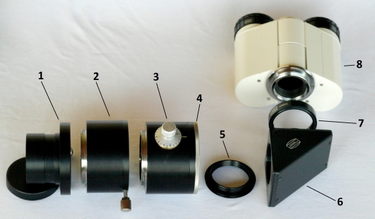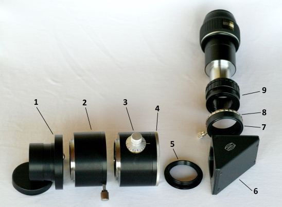 Mode 2: visual observation with focus extender, ADC, diagonal mirror and 1.25” eyepiece holder for telescopes from F/7 to F/10